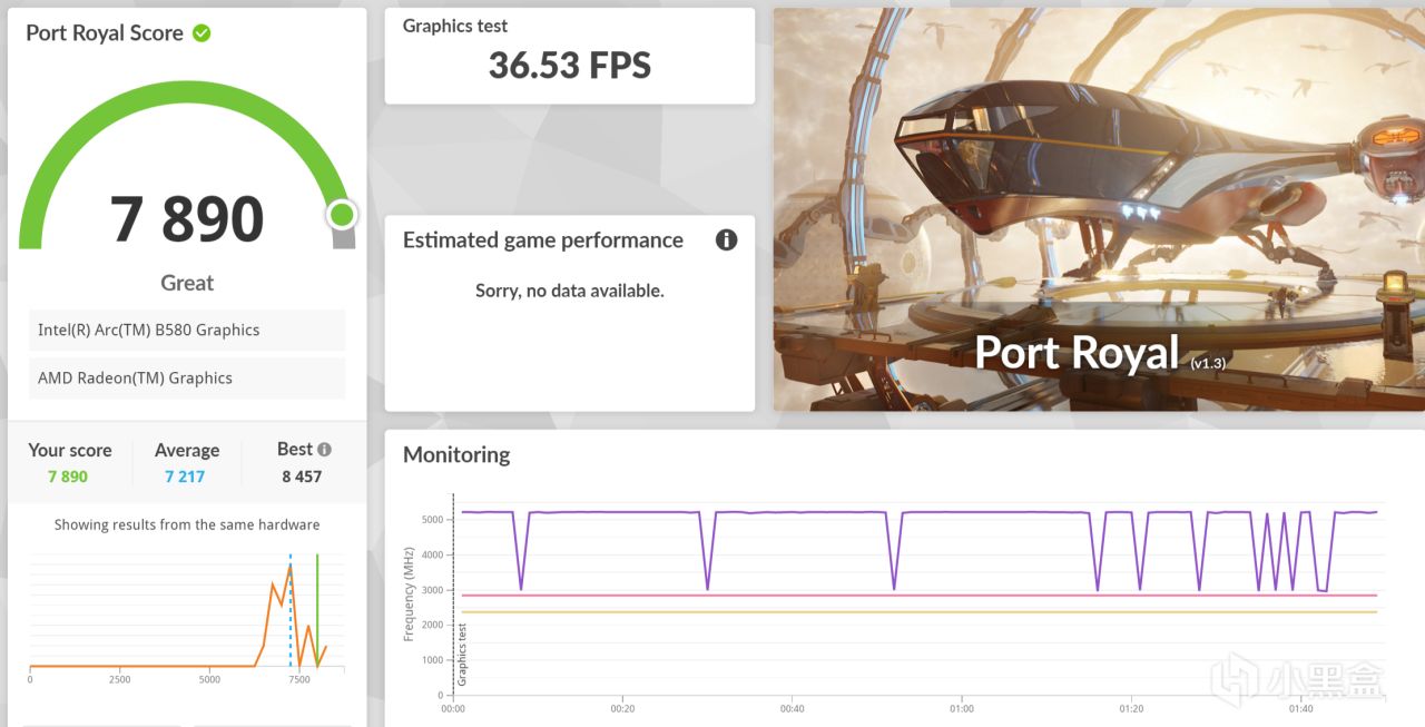 简单跑一跑3Dmark,intel的所有独显都是支持光追的,所有DXR光追都能跑。而且性能挺好的,PortRoyal接近8000分的成绩都快赶上4070了。其他得分比如FireStrike和TimeSpy,Arc B580也能超过4060和6750GRE不少