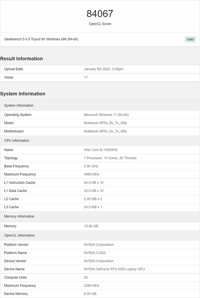 第三台不确定是哪一个品牌,只知道型号是 Notebook NP5x_6x_7x_SNx,配备的处理器是 Intel Core i5-13500HX 与 16GB 内存,独显为 NVIDIA GeForce RTX 4050,OpenCL 模式分数是 84067: