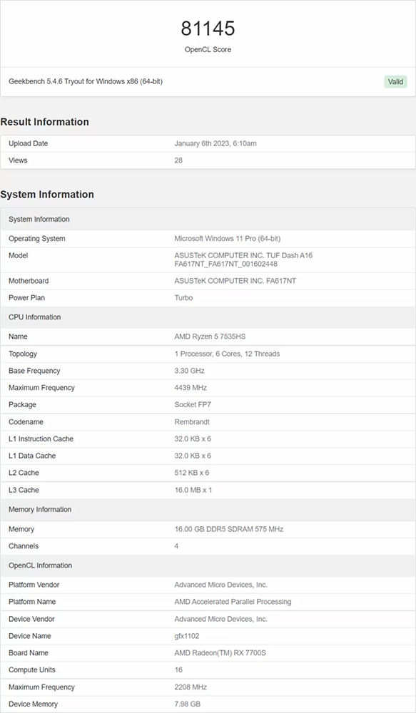 第四台为华硕的 TUF Dash A16,配备 AMD Ryzen 5 7535HS 处理器与 16GB 内存,GPU 独显为 AMD Radeon RX7700S,OpenCL 分数是 81145: