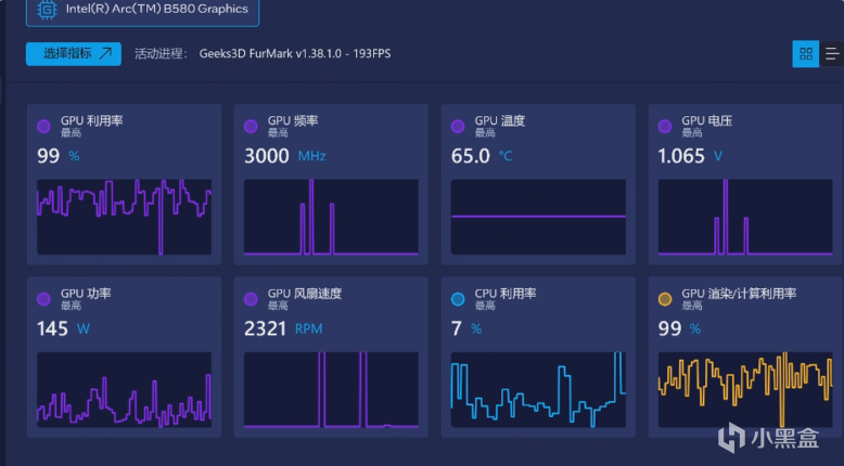 在甜甜圈10分钟满载压力测试下,它的功耗最高来到145W,此时温度为65度,毕竟是三风扇的显卡,温度表现的确要比双风扇的里程碑更好一些。