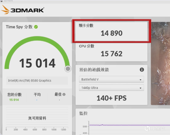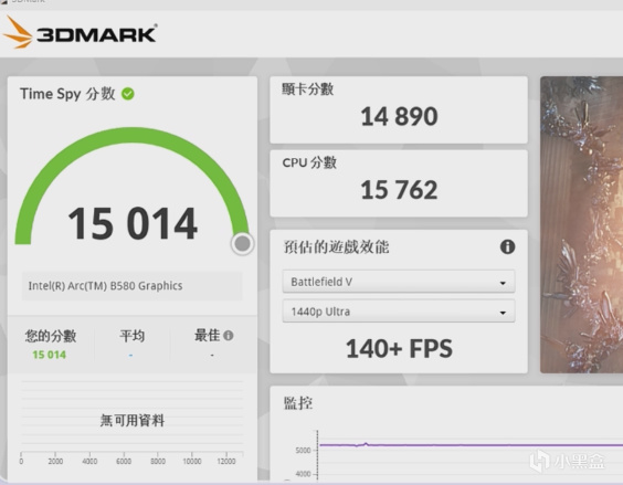 显卡方面,铭瑄的B580电竞之心在3DMARK TIME SPY 得分14890分,