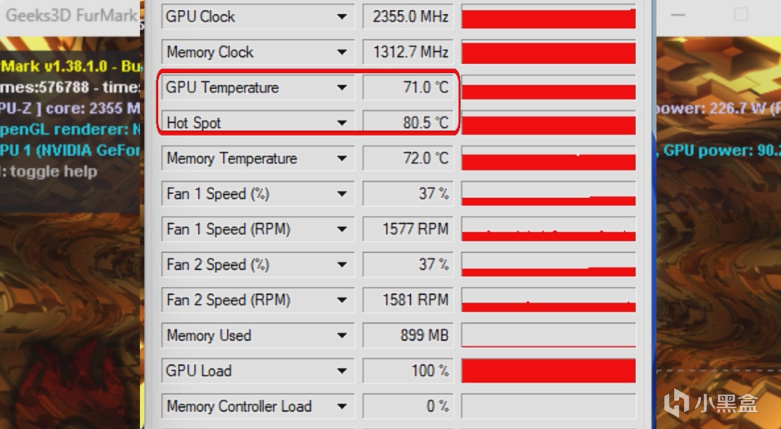 甜甜圈烤机测试测试中,在10分钟后我们发现,显卡此时功耗为200W时,它的GPU核心温度最终是来到了71度,热点温度此时来到了80.5度。