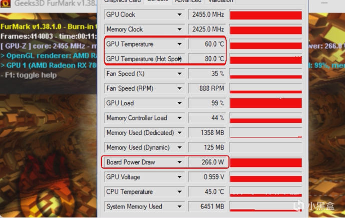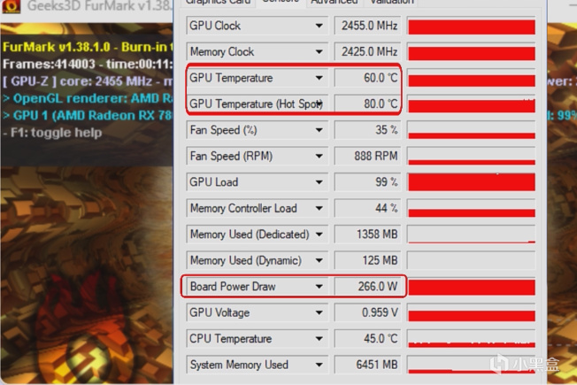 在甜甜圈烤机10分钟后,在功耗为266W时,GPU核心温度最终是来到了60度,热点温度来到了80度,