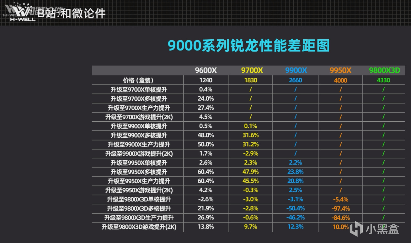 如果你对Intel 13、14代酷睿还是有一定的顾虑,又要考虑游戏性能、性价比甚至是生产力,那么现阶段游戏性能最接近9800X3D的9700X性价比是非常高的,在我们前面《9000系列锐龙升级价值详解》文章中,9700X在2K分辨率下游戏性能仅落后9800X3D 9.7%,已经无限接近7800X3D的游戏性能。