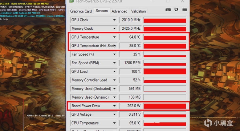 在Fur Mark烤机10分钟后,GPU核心温度为64度,热点温度为85度,功耗为262W。显卡买华硕一方面是保证显卡的做工用料,另一方面华硕也是为数不多支持三年个人送保的A卡品牌,购买还是很放心的。