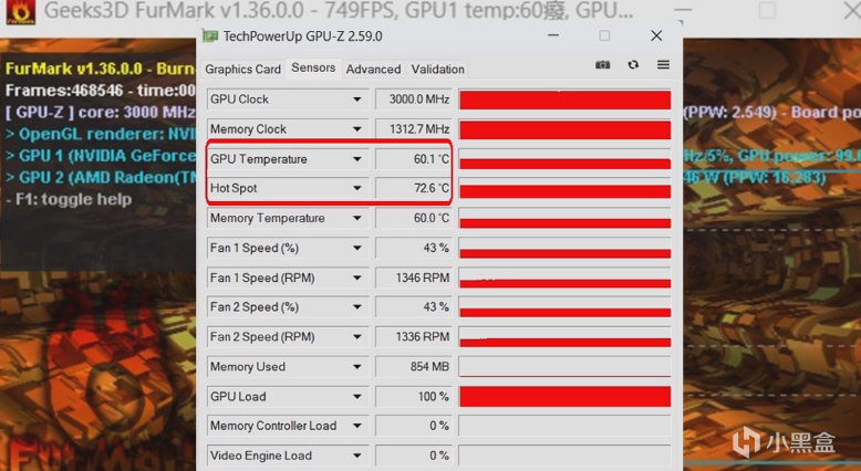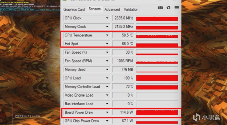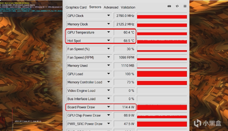 在甜甜圈烤机10分钟后,功耗为114.4W时,GPU的核心温度为60.4度,热点温度为68.5度,