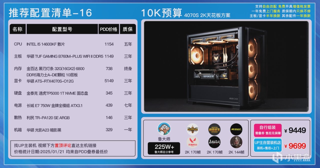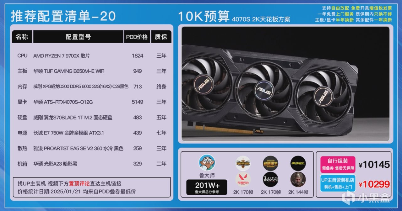 4070SUPER的方案,核心硬件主板和显卡继续使用的是华硕,对于小白玩家来说还是很有保障的,而且AM5主板的寿命至少可以用到2027年不更换接口,战未来属性也很不错。