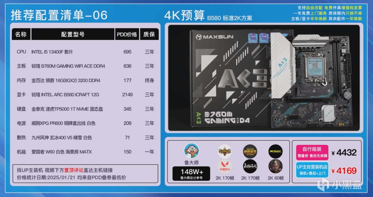 B580的方案,我们是在刚才无卡配置的基础上增加了一张显卡,13400F搭配铭瑄B760M GAMING ACE WIFI的板U组合依旧可以保留,而且铭瑄的电竞之心B580显卡是白色,整机颜色上搭配也非常和谐。