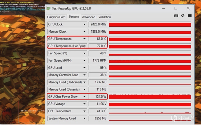 经过甜甜圈10分钟的满载压力测试,最终功耗是来到了137W,此时GPU的温度为65度,热点温度最终为77度,