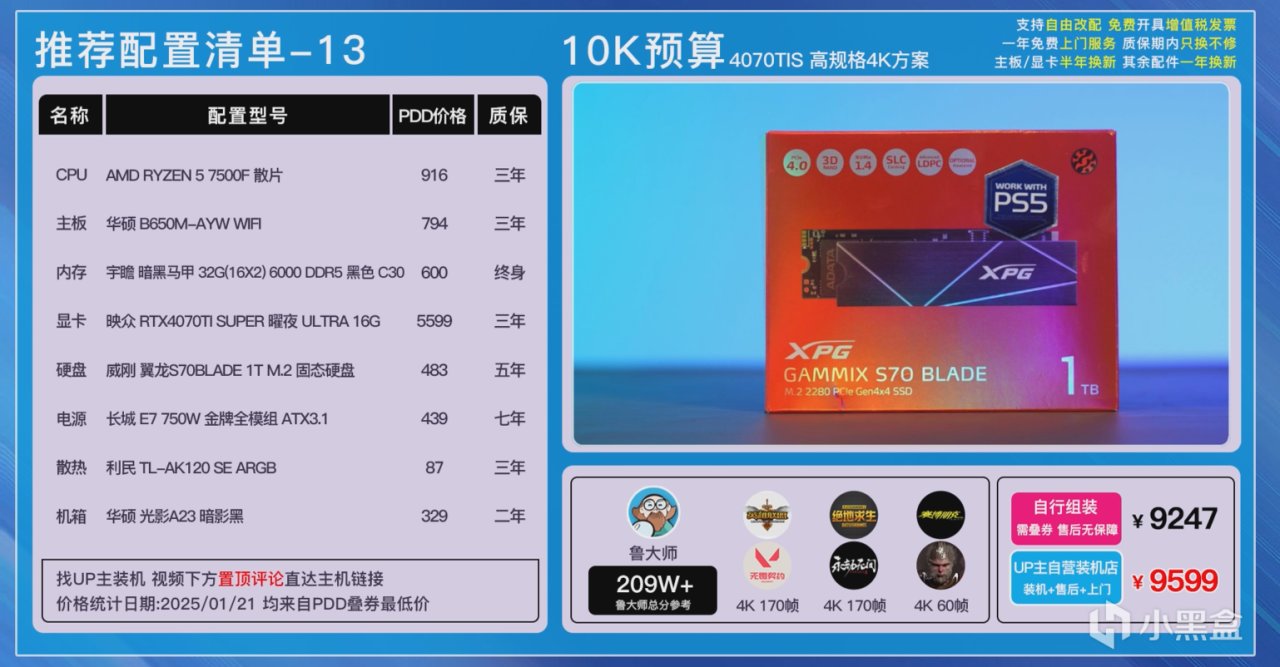 4070TI SUPER 的方案,我们是在无卡方案的基础上升级了一下硬盘,选择的是威刚的旗舰S70B PCIe4.0 TLC颗粒1TB。其余硬件大家都比较熟悉了。