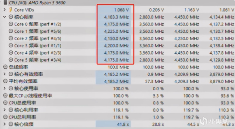 在单烤FPU10分钟的测试中,华硕的B550M-K完全可以将5600全核跑满至4.2Ghz,