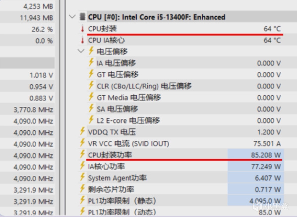 此时九州风神的玄冰400V5 晴雪可以将功耗为85W的13400F温度压制在64度,不仅主板可以跑满13400F,散热也没有任何的压力。