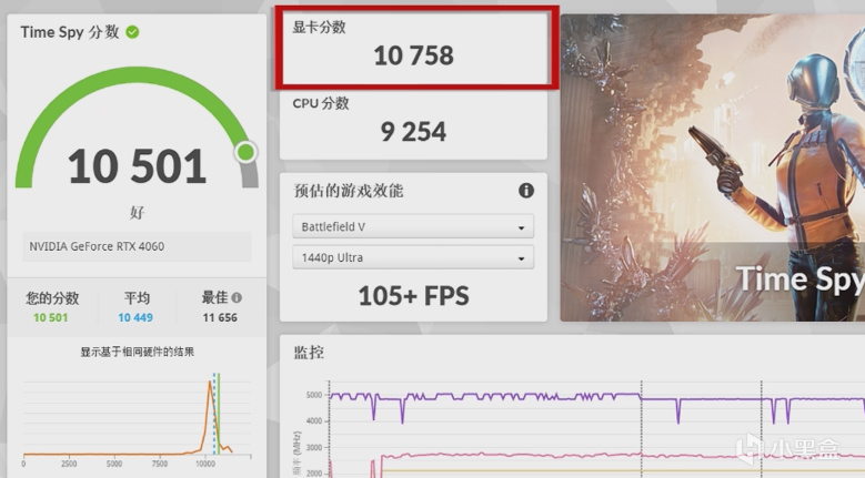 显卡方面,华硕4060 巨齿鲨在3D MARK TIME SPY 得分10758分,