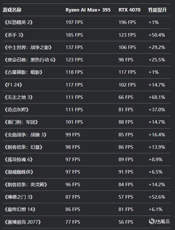 AMD 在 CES 上展示了 Ryzen AI Max+ 395 的游戏性能,并与 NVIDIA GeForce RTX 4070 笔记本 GPU 进行了对比。