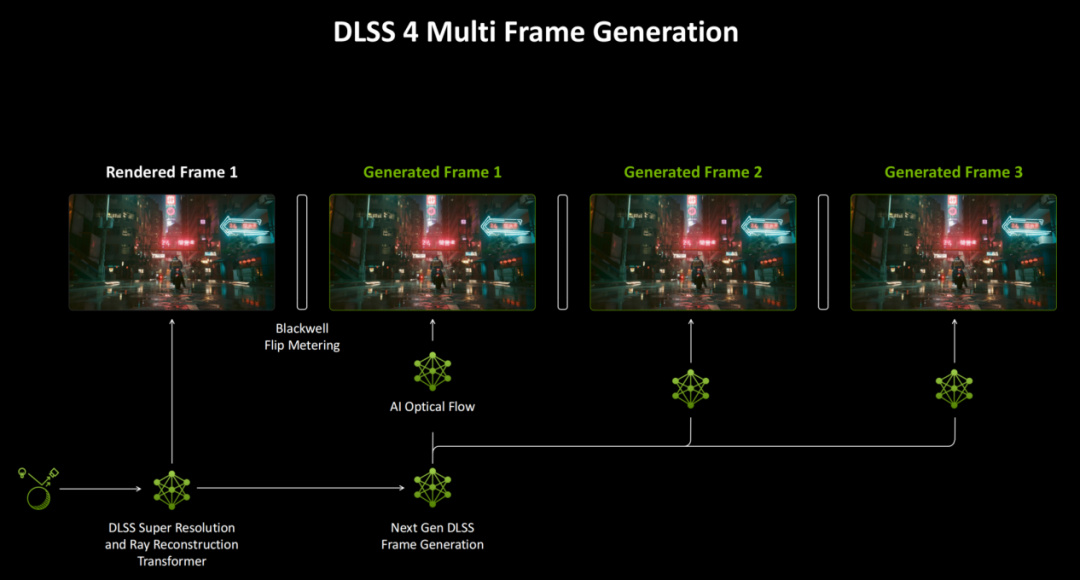 DLSS 3的帧生成,需要采集游戏中的运动向量和场景深度信息,经由显卡的光流加速器计算光流场来生成一帧;而DLSS 4的多帧生成不再需要光流加速器,而是用AI模型计算出光流,一帧原生渲染帧支持最多生成三帧。就算一次4X(1渲3)插帧需要5次模型运算,但也比之前的帧生成效果要好、延迟更低。