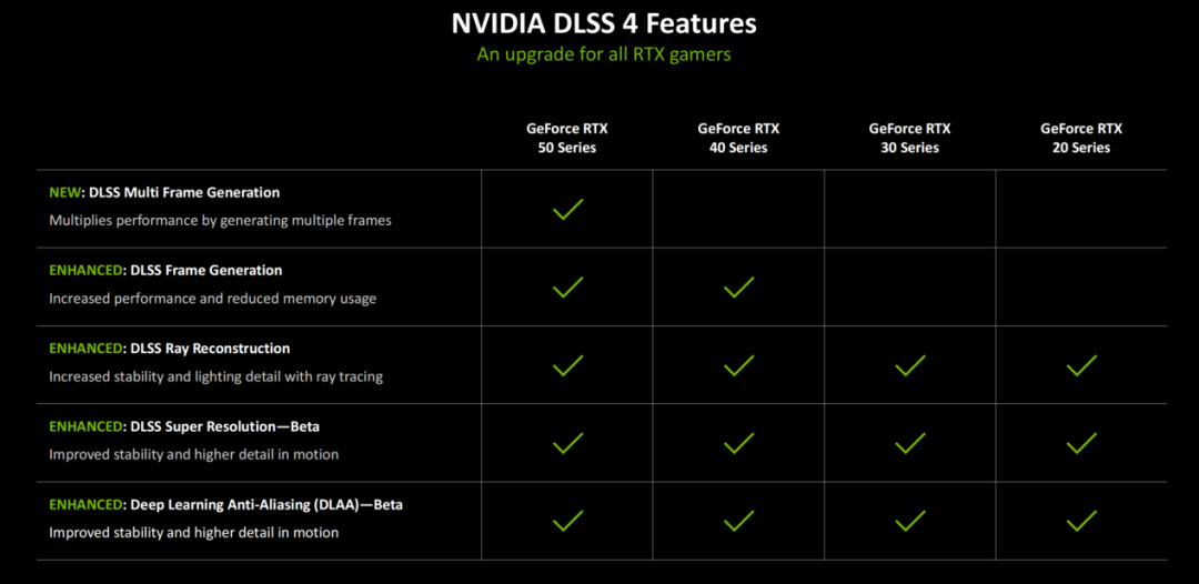 上面关于超分和光线重建的升级适用于所有RTX显卡,其中RTX 40系可以使用全新的DLSS 3帧生成模型,只是无法使用多帧生成,RTX 50系则可以使用全新的多帧生成模型。