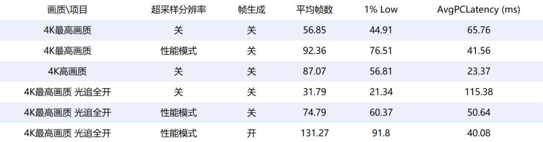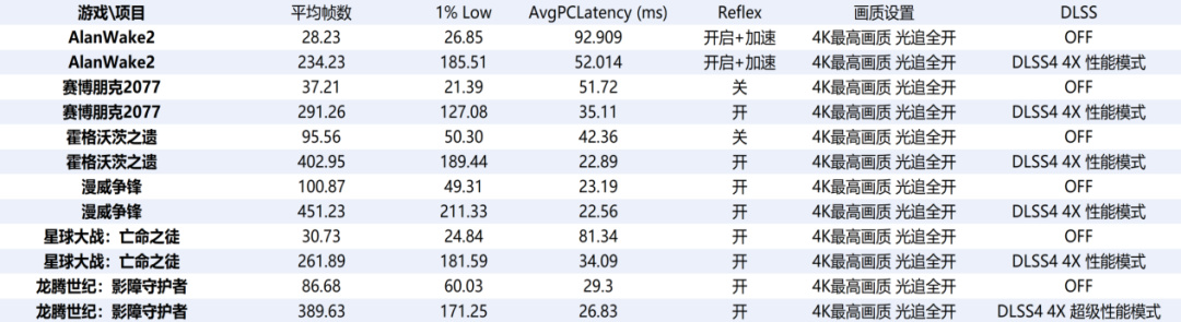 在几款已经有DLSS 4支持的游戏的测试数据里,可以看出在4K最高画质光追全开时,游戏开启DLSS 4多帧生成确实让帧数提升了3到8倍不等,又因为超分提高了原生帧的基础帧率,再加上Reflex技术,游戏延迟也都更低了。