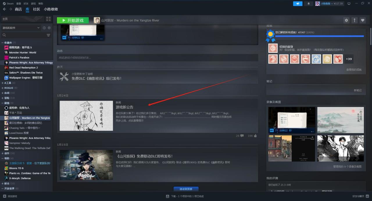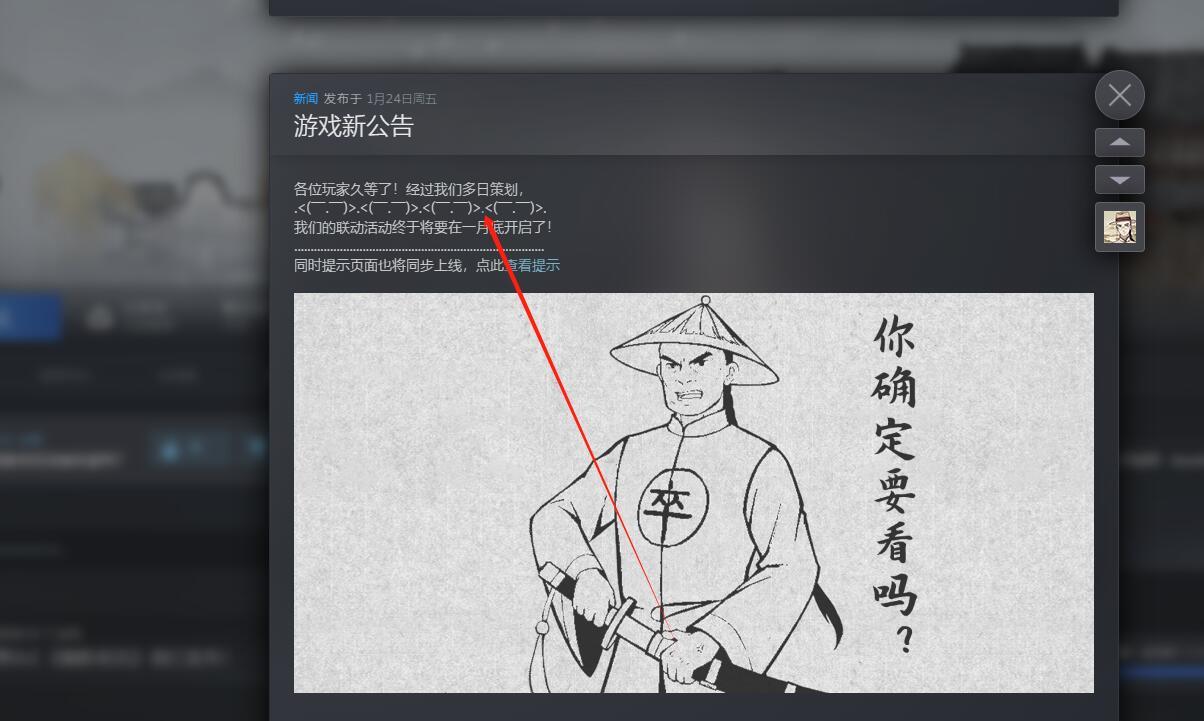 內容爲“點擊遊戲新公告日月間”,此時切到steam界面一臉疑惑的找新公告“日月間”,發現沒找到。