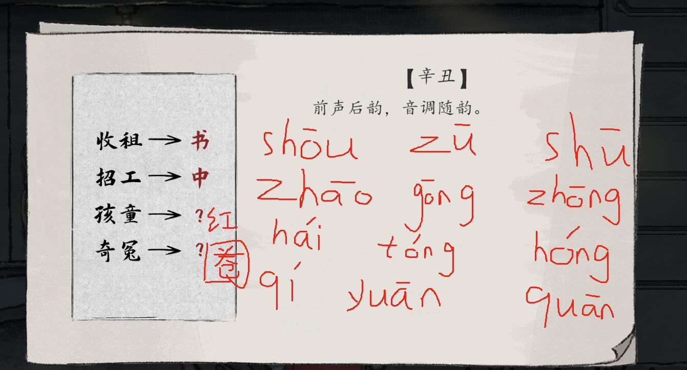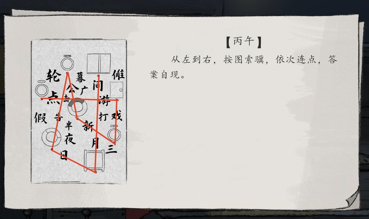 3.進入尋兇部分,打開知識的[丙午],注意到圖案均爲場景內容,從左到右依次記憶並在知識中連線可得下圖