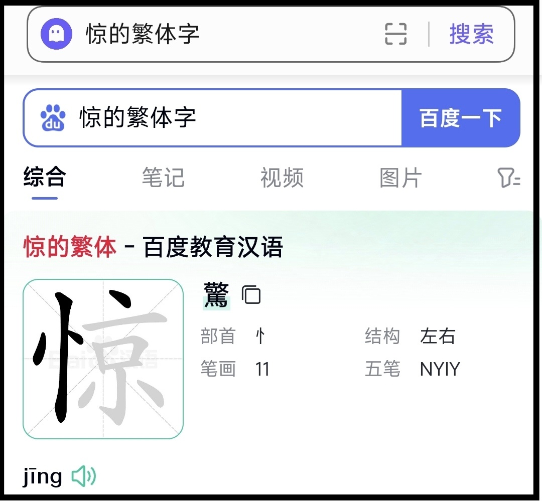 書中紅圈有一個較難辨識的字,按照前後文對應推測文字百度搜索繁體得到爲“驚”字