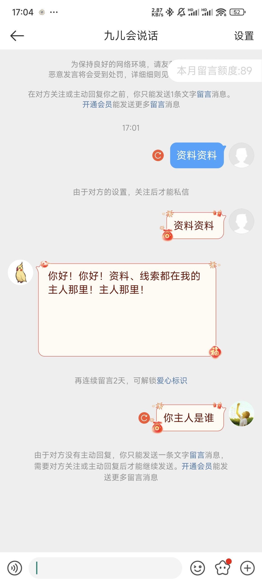 按照要求發送私信,第一次沒收到讓我關注,第二次發過去一臉疑惑,問了一下發現沒有留言機會需要vip並且彈出了充值界面,然後就放棄繼續遊玩了。
