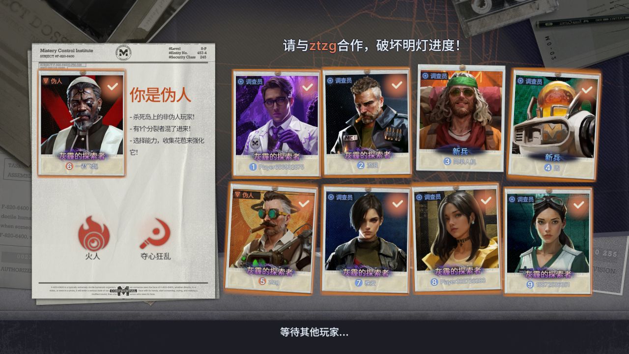 3.除了PvP和PvE的结合狼人杀模式"雾中来客"(6-9人),还有另外两个剧本:PvP+PvE吃鸡大逃杀模式“停电”(4-9人),以及合作PvE模式“收容失效”(1-4人)。