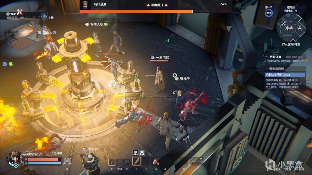 每晚收圈清小怪时,就是信息交流和伪人露馅的好时机。这个时候跟随上方的明灯进度条,伪人会选择摧毁发电机或者趁乱杀人(开技能)。因为每个人都有击杀能力,所以投票功能基本上在这款游戏中弱化了。每晚到来的小怪可以在白天在外面逐一击杀,这样对于调查员来说,晚上的压力就会小一点!
