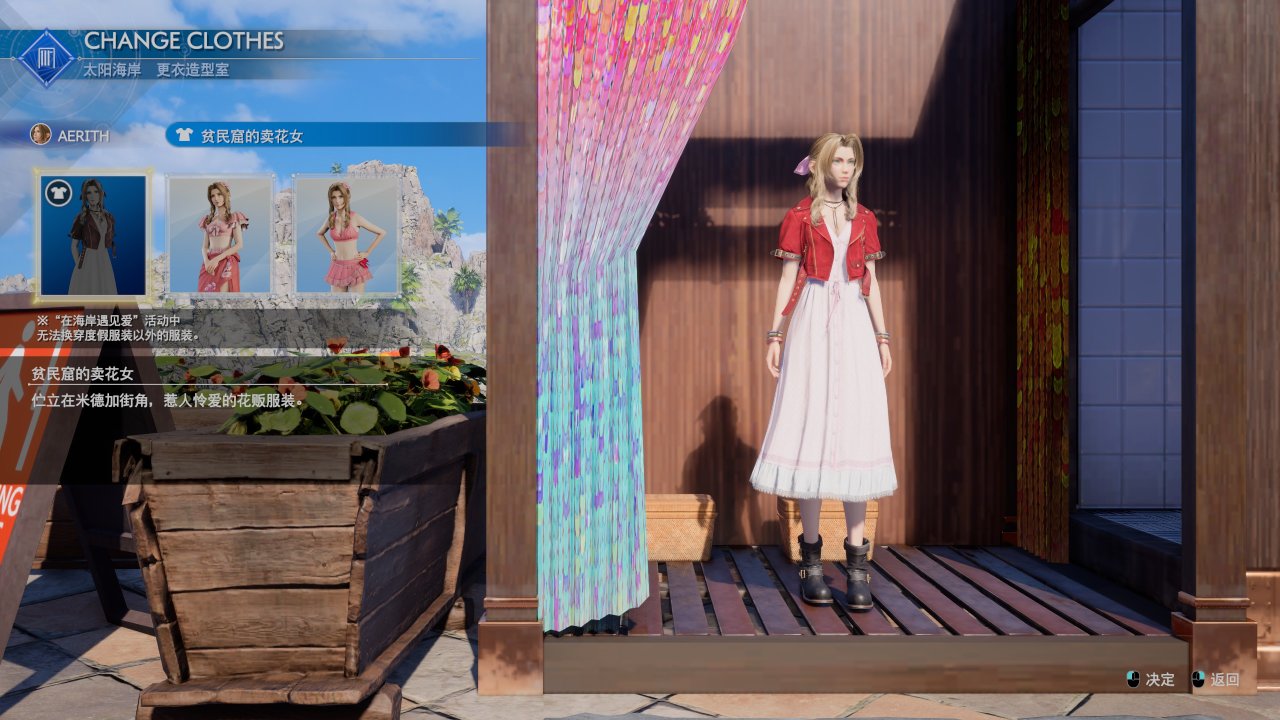 兌換好服裝後,就在照相館背後的更衣室換衣服,可以看到除了初始衣服還多了兩套服裝,愛麗絲推薦粉色人魚,蒂法我更喜歡閃耀魚鰭。接下來也別急着推主線,我建議穿泳裝多逛逛,可以玩玩彈鋼琴的小遊戲,全成就中有一個鋼琴成就,需要把6首鋼琴曲彈到A級評分,主機端的時候第六章我玩了好久才捨得繼續推進主線