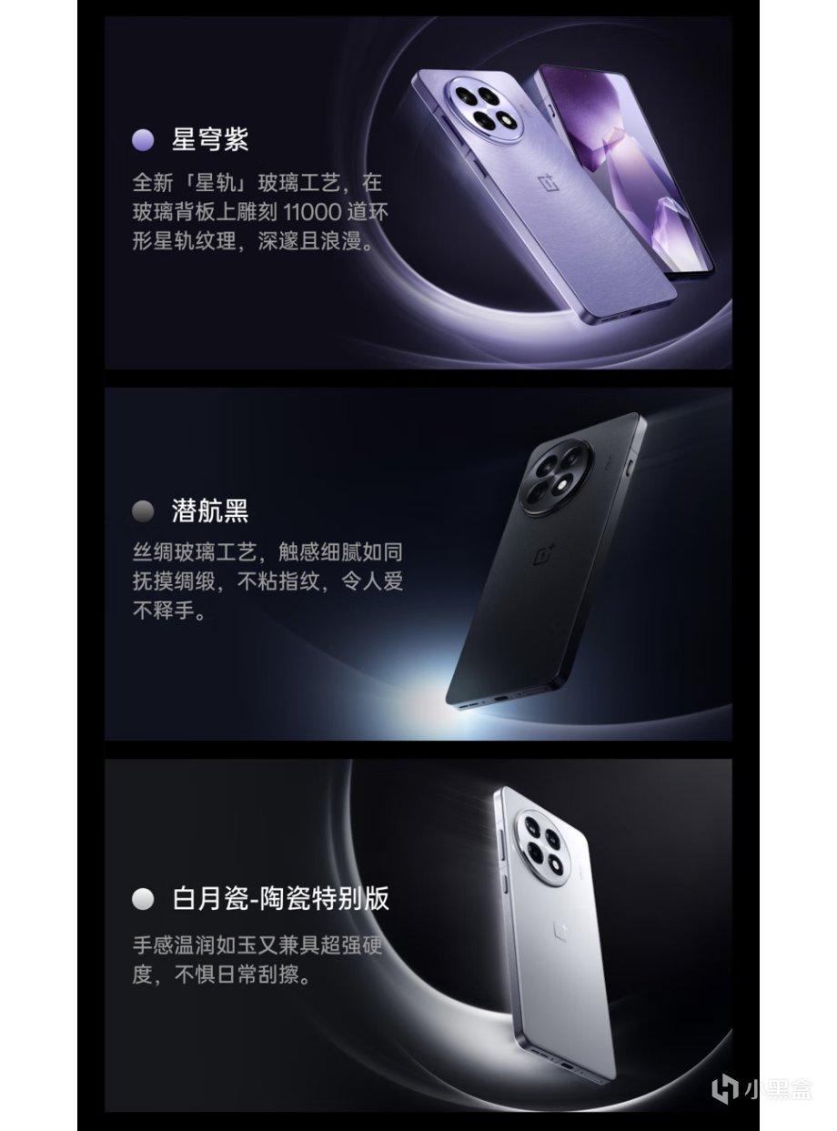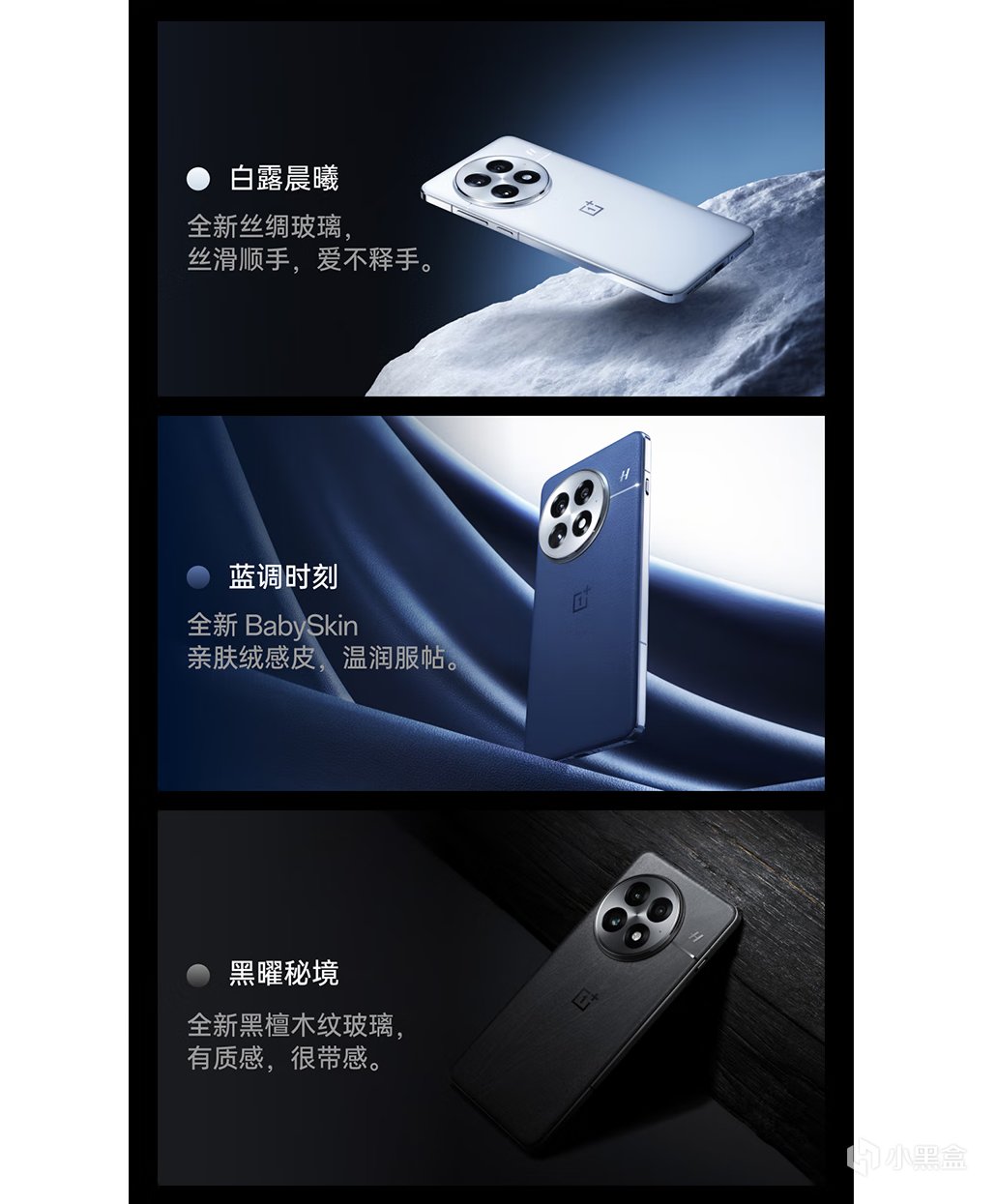 颜色方面,一加13有【白露晨曦】、【蓝调时刻】、【黑曜秘境】三款,材质分别是丝绸玻璃、亲肤绒感皮、黑檀木纹玻璃,白色版本算是延续了初代“BabySkin”手感,蓝色更商务,黑色更沉稳。