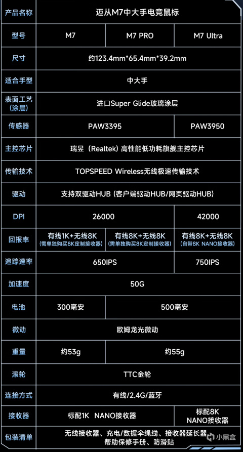 1:M7 区别:传感器:PAW3395 DPI:26000 回报率:有线1K+无线8K(需单独购买8K定制接收器) 追踪速率:650IPS 电池:300毫安 重量:约53g 接收器:标配1 K NANO接收器