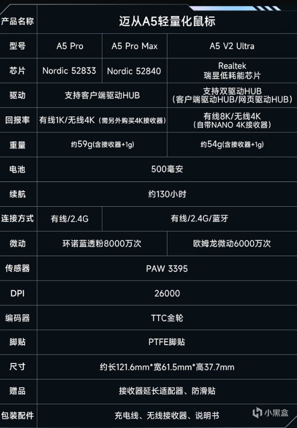 2:A5ProMax 区别:芯片:Nordic 52840 回报率:有线1K/无线4K(需另外购买4K接收器 重量:约59g(含接收器+1g) 连接方式:有线/2.4G 微动:环诺蓝透粉8000万次