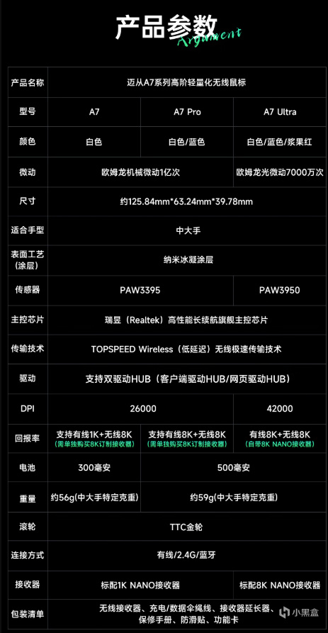 2:A7 Ultra 区别: 颜色:白色/蓝色/浆果红 微动:欧姆龙光微动7000万次 传感器:PAW3950 DPI:42000 回报率:有线8K+无线8K(自带8 K NANO接收器) 电池:500毫安 重量:约59g(中大手特定克重) 接收器:标配8 K NANO接收器