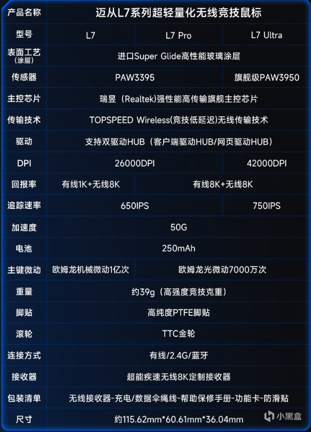 1: L7 区别:传感器:PAW3395 DPI:26000 回报率:有线1K+无线8K 追踪速率:6501PS 主键微动:欧姆龙机械微动1亿次