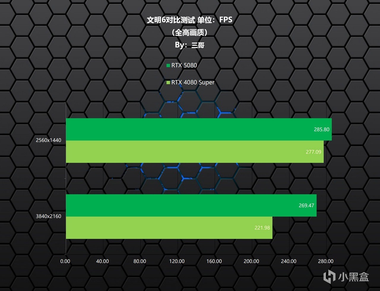 在《文明6》測試中,RTX 5080相較RTX 4080 Super取得了大幅度領先,其中在2560x1440分辨率下取得了8.71幀的領先優勢,在3840x2160分辨率下取得了47.49幀的領先優勢。