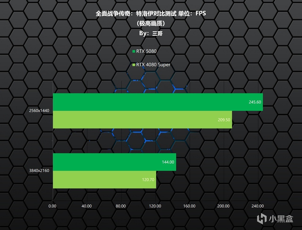 在《全面戰爭傳奇:特洛伊》測試中,RTX 5080相較RTX 4080 Super取得了大幅度領先,其中在2560x1440分辨率下取得了36.1幀的領先優勢,在3840x2160分辨率下取得了23.3幀的領先優勢。