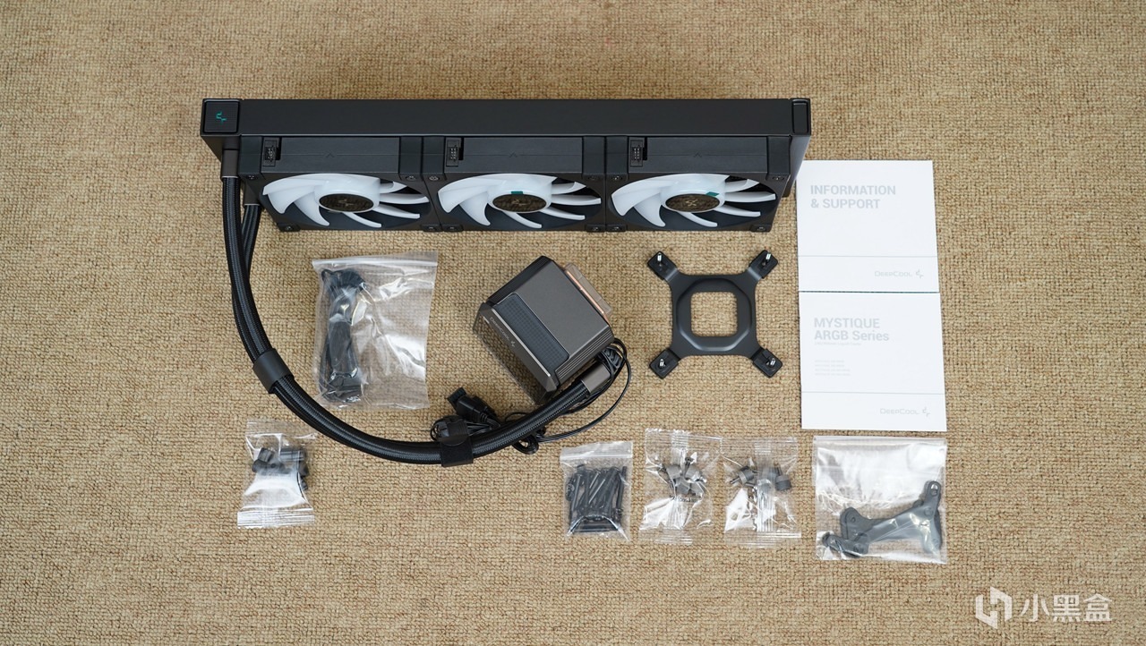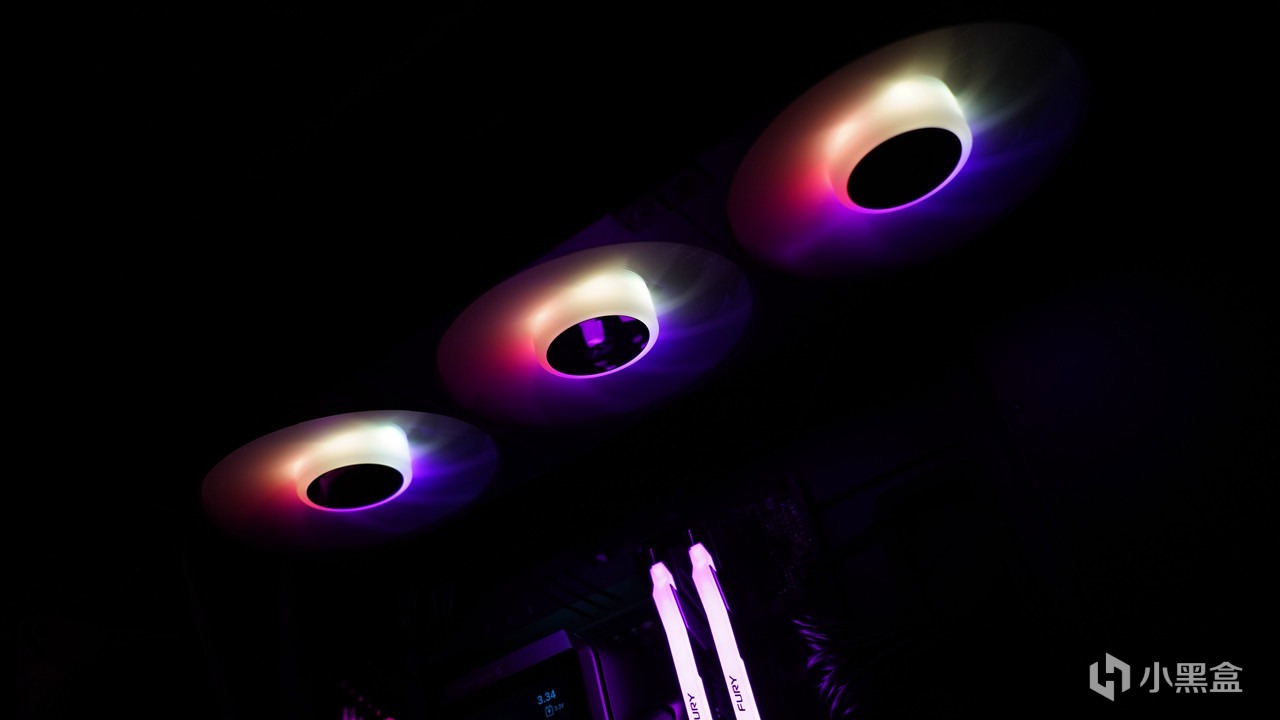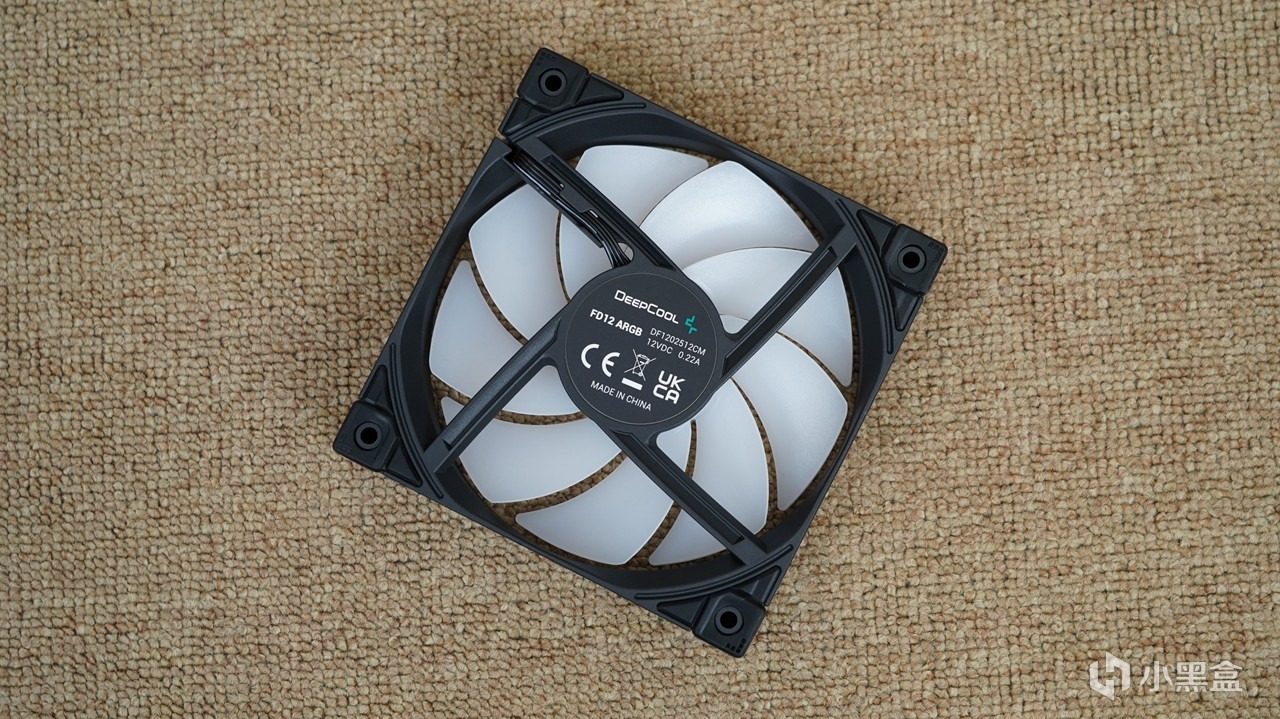 水冷標配了三把FD12ARGB高性能風扇,風扇採用ARGB燈珠內置中心軸設計,色彩更加均勻柔和;風扇採用黑白相間的配色,看起來黑白分明,簡約大氣;風扇扇框邊角採用全包膠設計,減震吸噪效果非常出色。