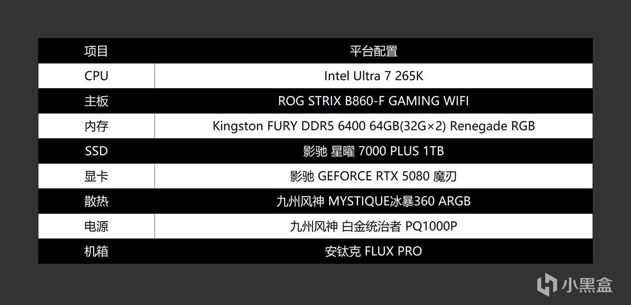 此次測試,正好使用影馳 GEFORCE RTX 5080 魔刃顯卡配合Intel Ultra 7 265K CPU+ Kingston FURY DDR5 6400 64GB(32G×2) Renegade RGB內存+影馳 星曜 7000 PLUS 1TB SSD+九州風神 MYSTIQUE冰暴360 ARGB水冷+九州風神 白金統治者 PQ1000P白金牌電源+安鈦克 FLUX PRO機箱打造了一臺高端主機,下面就將其分享給大家吧。