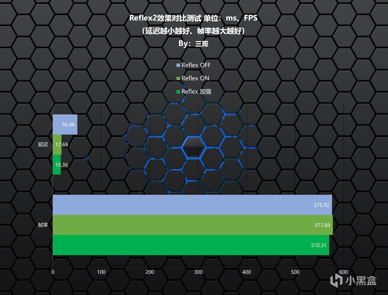 利用lNVIDIA FrameView記錄測試結果並做成柱狀圖,可以看出,開啓Reflex 2技術後,遊戲的延遲大幅度降低,同時幀率幾乎沒有受到影響。