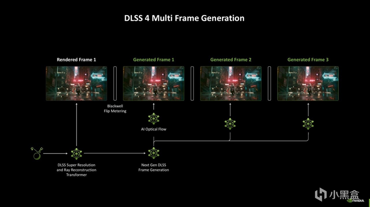 雖然在常規的遊戲測試中,RTX 5080已經嶄露頭角,但它的威力遠不止於此,新一代的Blackwell架構革命性的加入了DLSS 4技術,可藉助AI爲每個渲染幀額外再生成三幀,這能夠大大提高遊戲的幀率。該技術可與全套DLSS技術協同運行,與傳統的渲染技術相比,最高可提升8倍性能。