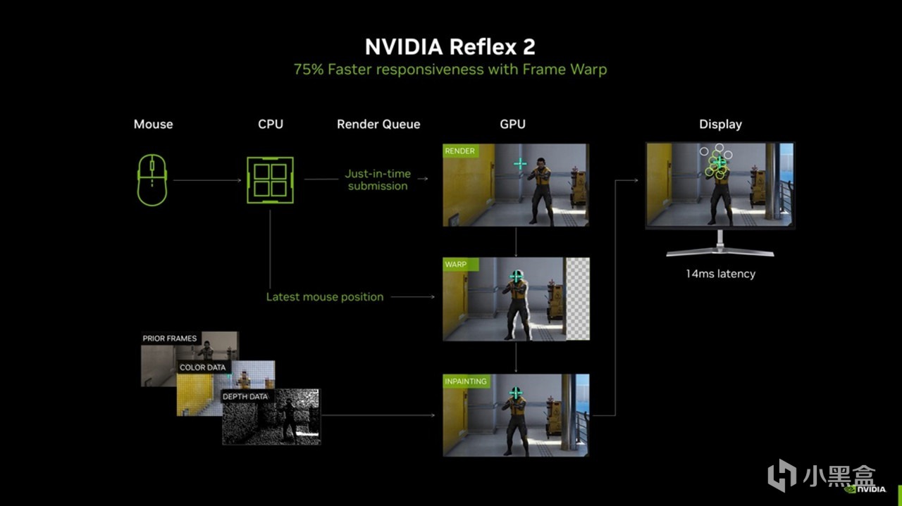 RTX 5080還加入了新一代的NVIDIA Reflex 2技術,該技術將Reflex低延遲模式與新的Frame Warp技術相結合,可根據最新的鼠標輸入信號更新渲染幀,再將其發送到顯示器,從而降低遊戲延遲。與原生畫質的渲染相比,Reflex 2最高能降低75%的延遲,這不僅能爲電競玩家帶來翻天覆地的制勝優勢,也能提高普通玩家操作單人遊戲時的響應速度。