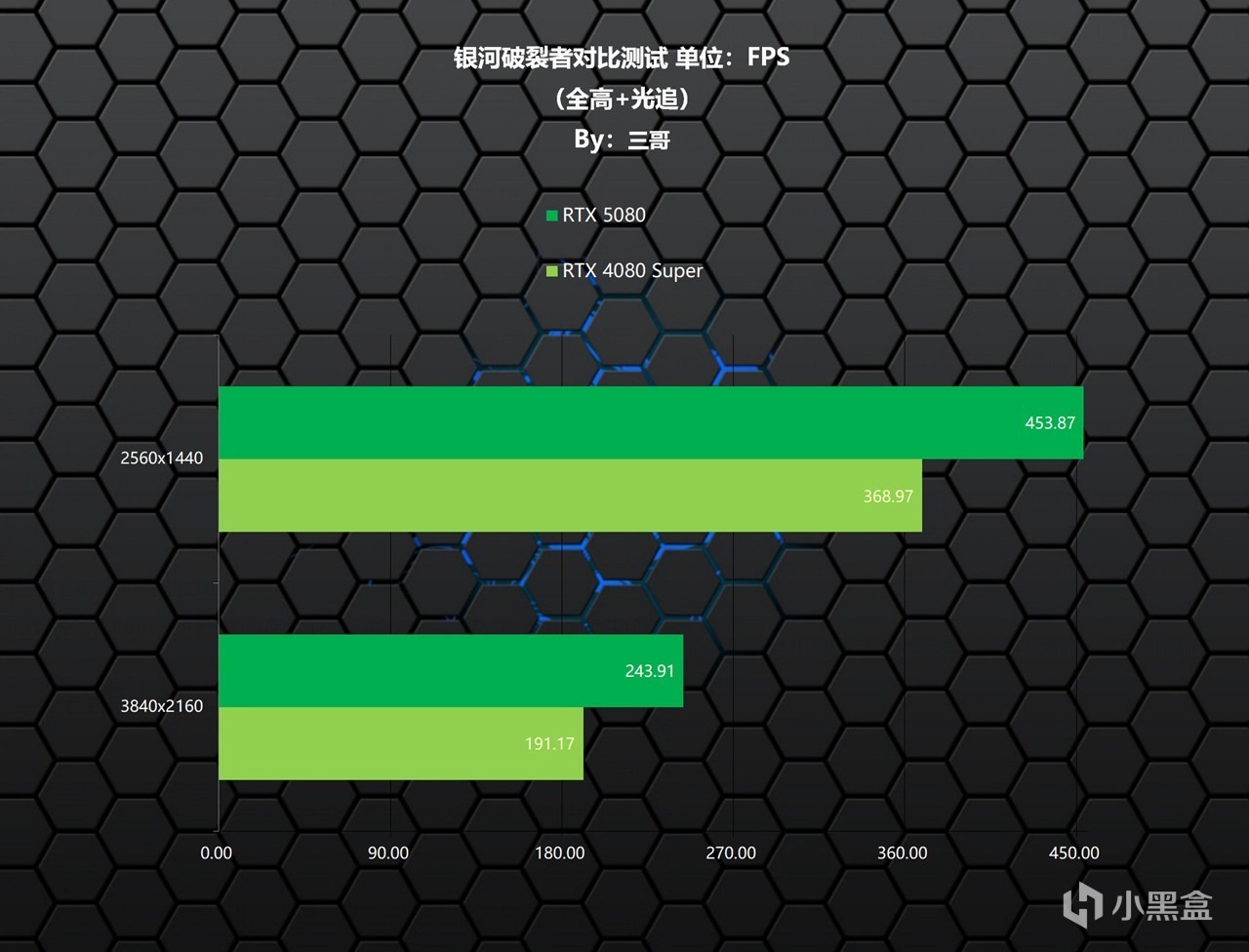 在《銀河破裂者》測試中,RTX 5080相較RTX 4080 Super取得了非常大幅度的領先,其中在2560x1440分辨率下取得了84.9幀的領先優勢,在3840x2160分辨率下取得了52.74幀的領先優勢。