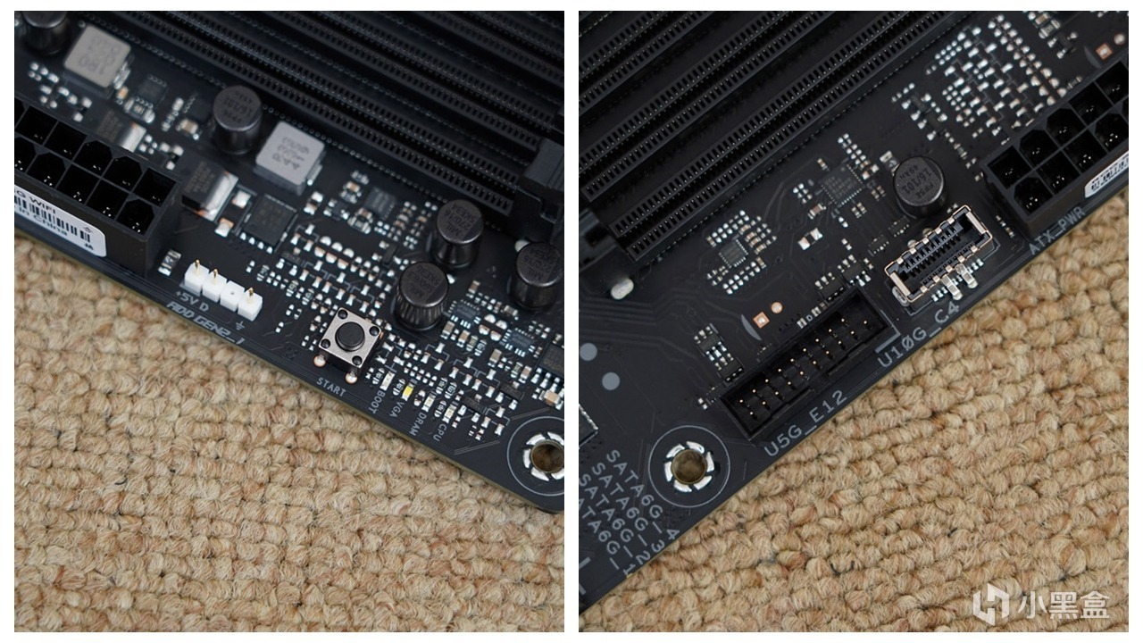 在內存插槽下方,主板提供了1個5V RGB接針和1個開機按鈕,還提供了1組USB 5Gbps接口和1個採用金屬加固設計的USB 10Gbps Type-C接口,擴展性非常強。