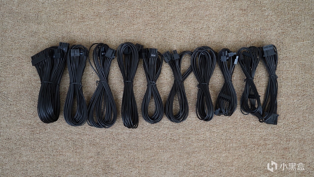 電源提供了非常充足的全模組壓紋線,該線材質感出色,分量十足,理線效果和實用效果都非常不錯,其中12V-2x6顯卡供電線更是採用了優質105°C阻燃線材和16AWG銅芯,可爲新一代顯卡及擴展卡提供高達600W的供電。