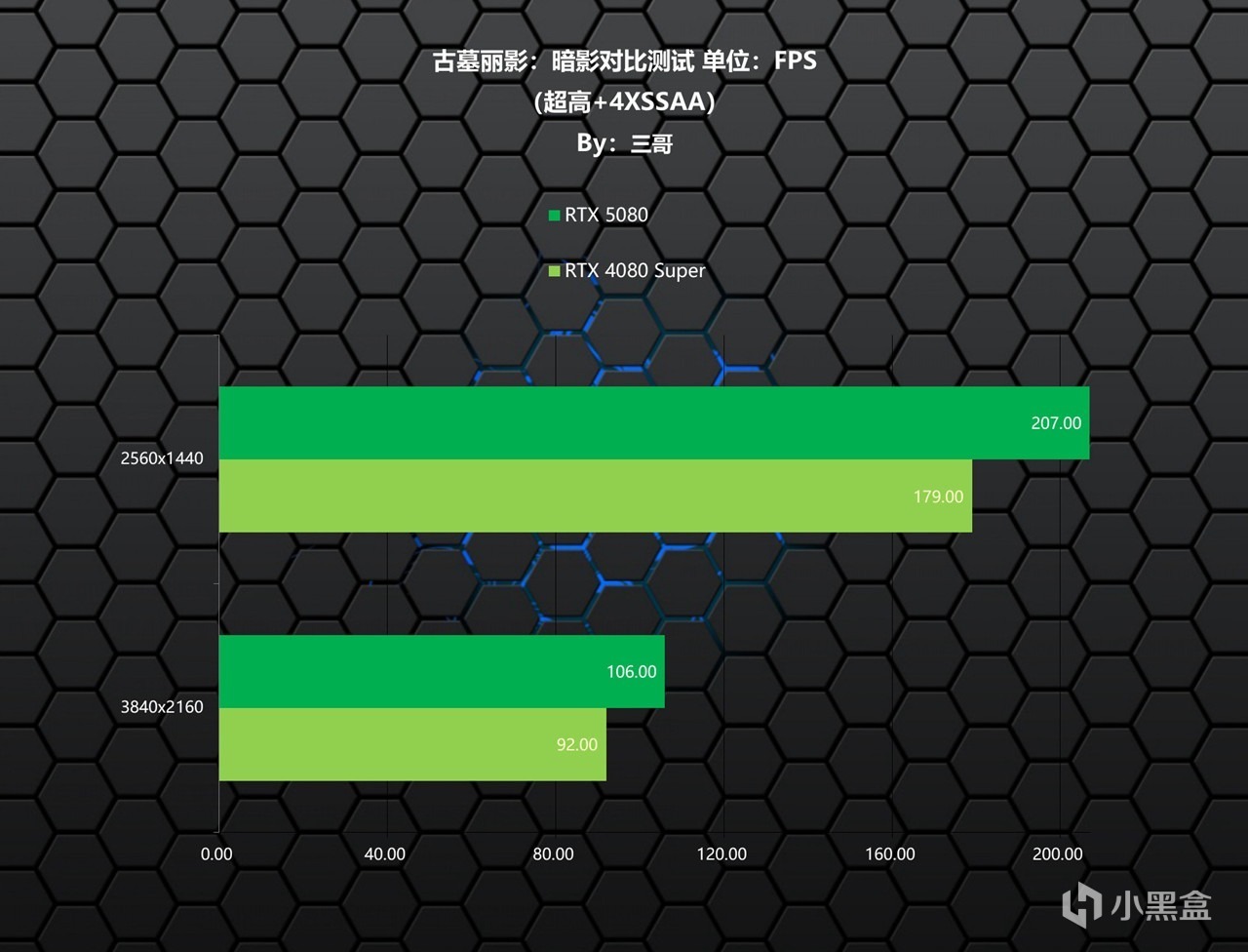 在《古墓麗影:暗影》測試中,RTX 5080相較RTX 4080 Super取得了大幅度領先,其中在2560x1440分辨率下取得了28幀的領先優勢,在3840x2160分辨率下取得了14幀的領先優勢。