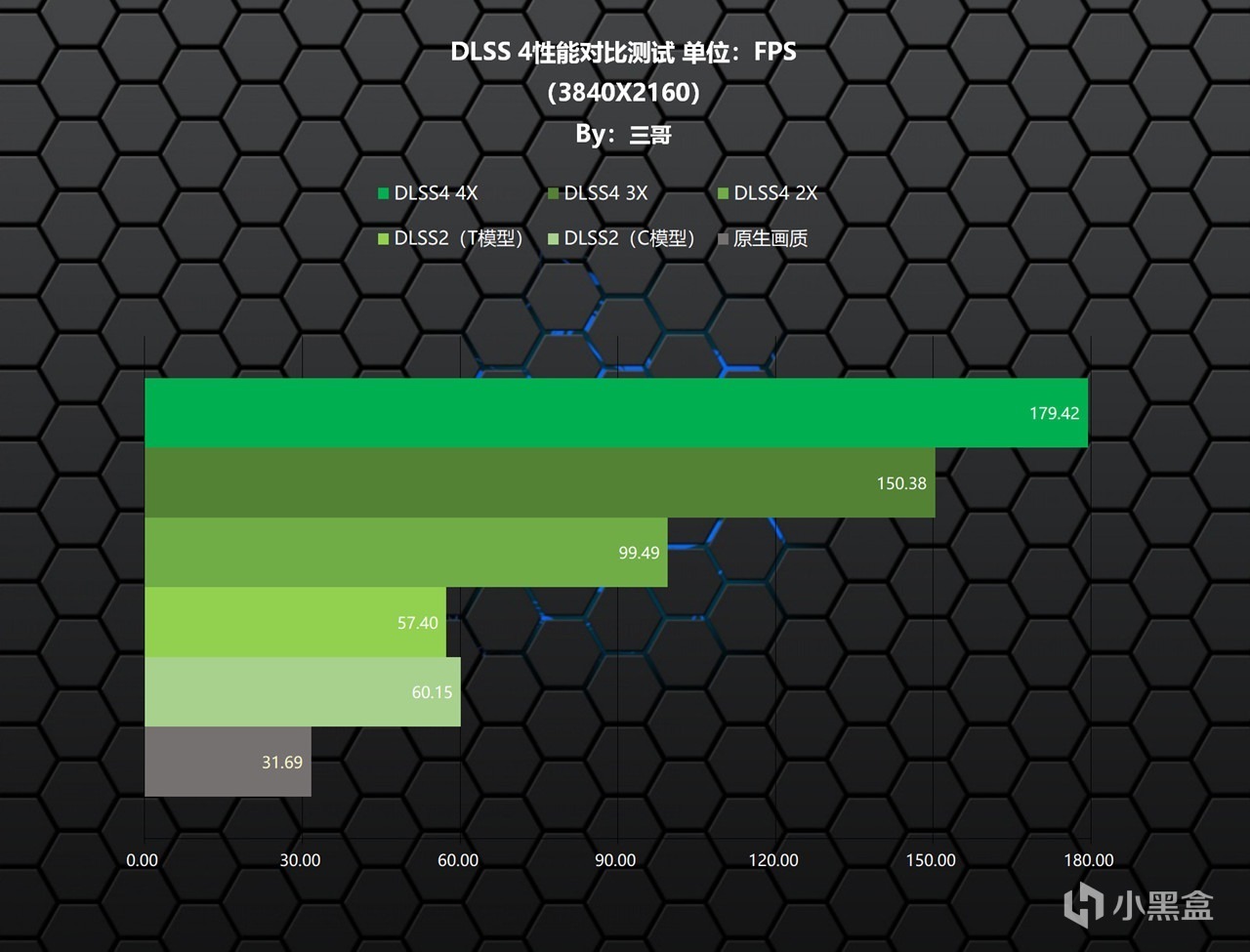 對比一下,這裏以DLSS超解析度開品質檔爲例,可以看出,DLSS 4 4X檔的性能是最強的,3X檔其次,2X檔再次,和DLSS 2比起來,幀率直接提升了數倍,和原生畫質相比,提升倍率就更不用說了。
