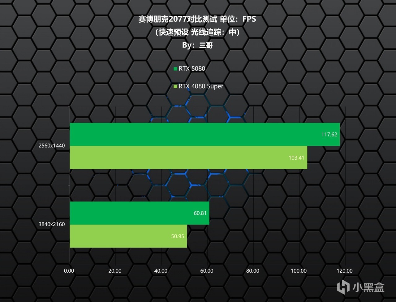 在《賽博朋克2077》測試中,RTX 5080相較RTX 4080 Super取得了大幅度領先,其中在2560x1440分辨率下取得了14.21幀的領先優勢,在3840x2160分辨率下取得了9.86幀的領先優勢。