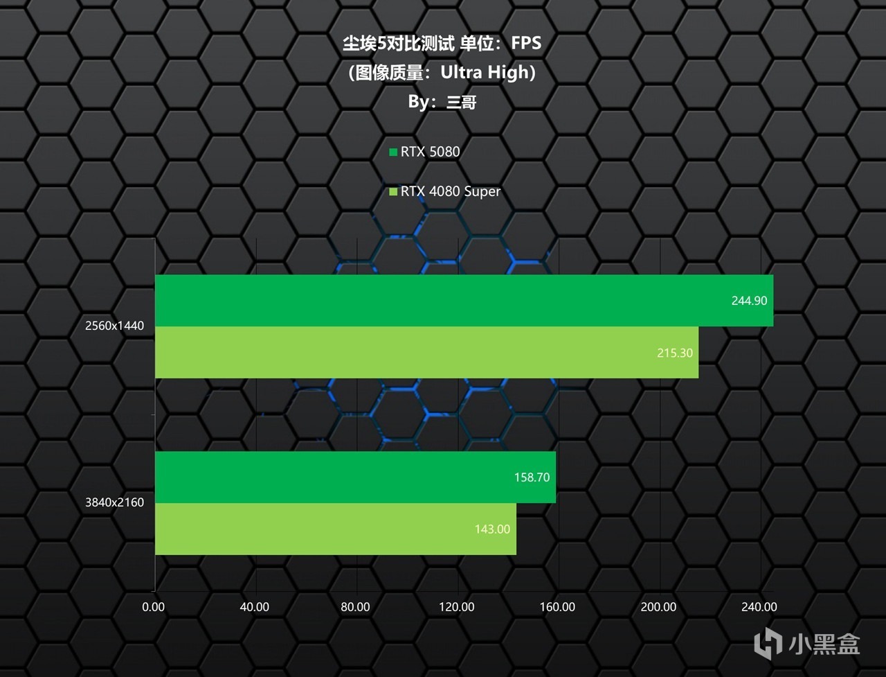 在《塵埃5》測試中,RTX 5080相較RTX 4080 Super取得了大幅度領先,其中在2560x1440分辨率下取得了29.6幀的領先優勢,在3840x2160分辨率下取得了15.7幀的領先優勢。