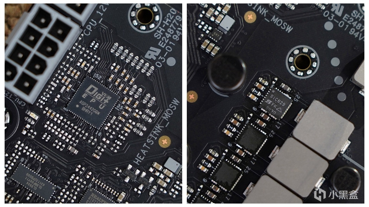 供電核心元件特寫,其中左側爲DIGI+ EPU ASP2442供電數字控制芯片,右側爲威世SIC629 Dr.MOS。