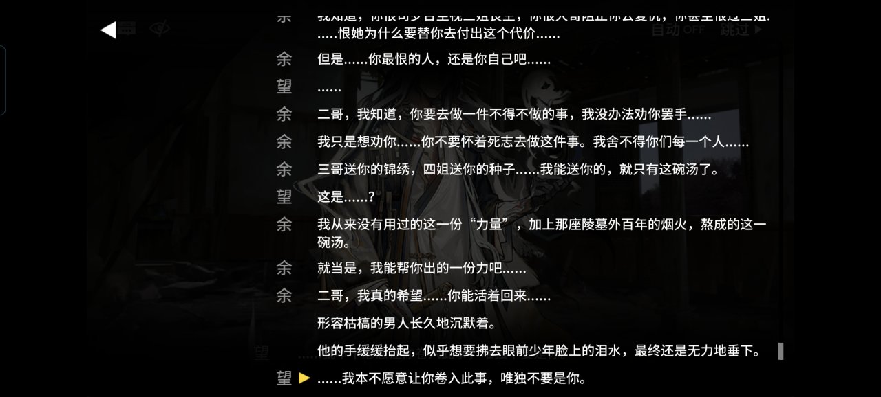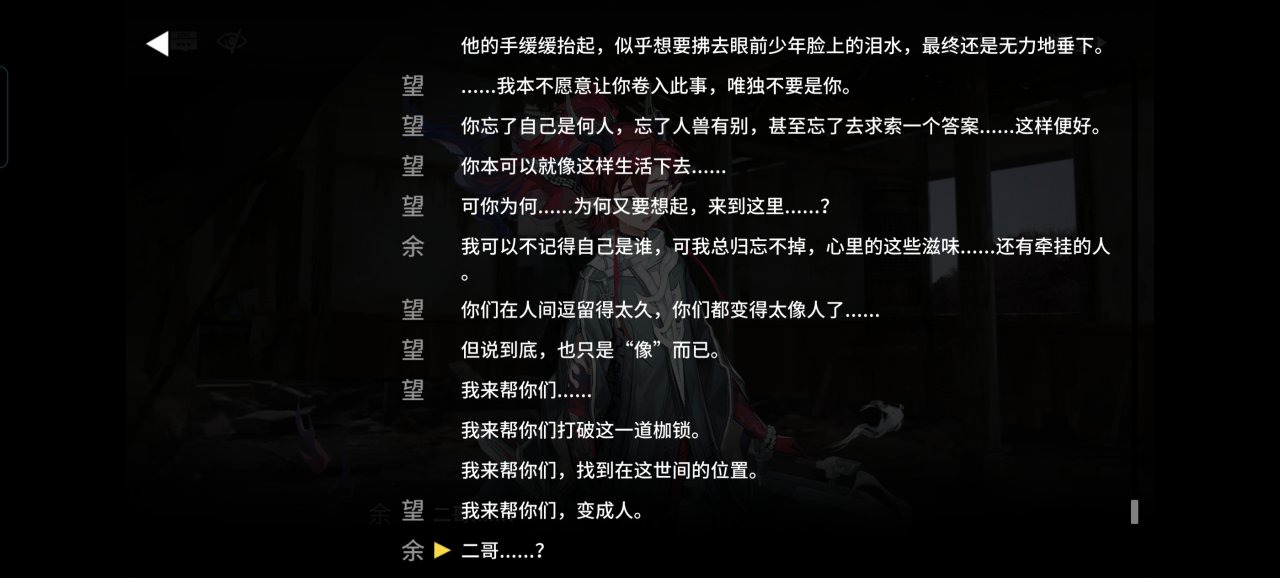 二哥望從此被大炎政府定爲罪人囚禁起來,他痛恨自己的同時也痛恨大炎沒有傾力相助,尤其是痛恨自己實力太弱。但是無論怎麼推算,歲獸醒來是必然,爲了保住大家,望化整爲零把自己分身成圍棋的棋子越獄成功,並在績的幫助下開始自己的謀劃,這一次他要拿走更多兄弟姐妹的神力來做自己的計劃。包括之前想辦法偷大哥的身軀化劍、績把大炎的國運編製成的衣服、黍給他的種子(代表黍的能力因果)、和這一次餘啓動自己神力爲他熬製的湯等等。