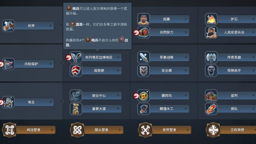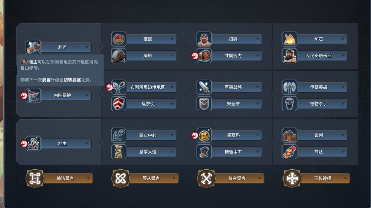 2.軍事路線(適合單人):地主—皇家大道—德西瑪—內陸保護—邊境地區—軍事戰略/安全感—傳奇英雄